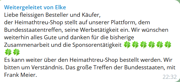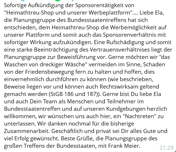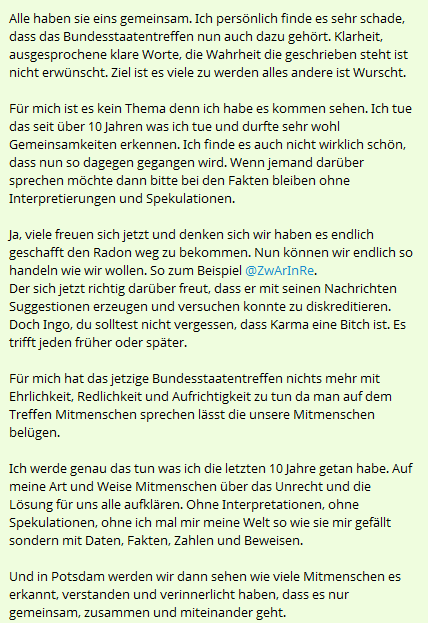 Sehr vielen Menschen ist es aufgefallen und sie haben sich gefragt was das soll? Sie hatten für sich festgestellt, dass Thomas, Thomas, Ingo, Niklas, Sacha, Klaus Maurer, Matthes Haug, Ronald Gehlken, Herr Staats, Markus Lowien rechtlich gesehen auf Vorträgen, Zusammenkünften etc. Lügen von sich geben. Genau diese Verbindungen bestehen jetzt zum Bundesstaatentreffen. Das hat nicht nur ein komisches Geschmäckle, dass stellt durch diese Verbindung das Bundesstaatentreffen in ein Licht wo es nicht hin gehören sollte = Unredlichkeit, Täuschungen und Lügen.