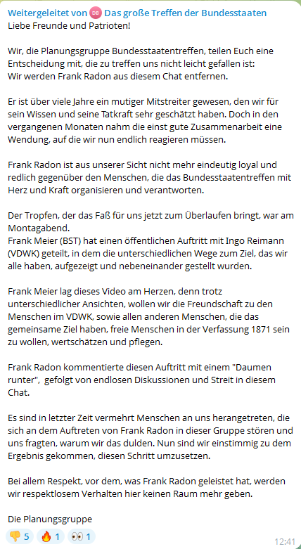 „Frank Radon ist aus unserer Sicht nicht mehr eindeutig loyal und redlich gegenüber den Menschen, die das Bundesstaatentreffen mit Herz und Kraft organisieren und verantworten.“