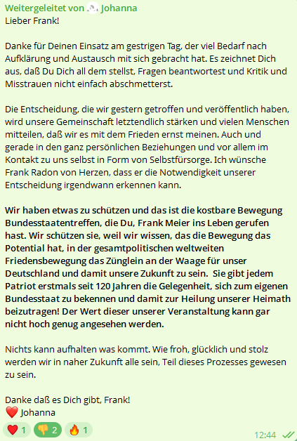 Später kam die Verbindung des „Staatsvolktreffen“ mit Herrn Staats, Ronald Gehlken und Markus Lowien, der auf jeden Zug aufspringt, dazu. Herr Staats und der selbsternannte „Staatssekretär der Justiz“ Ronald Gehlken von dem nicht existierenden „Präsidialstaat Preußen 1919“, haben das „Staatsvolktreffen noch viel mehr in das unredliche Licht gestellt. Somit nicht nur das „Staatsvolktreffen“ sondern auch das Bundesstaatentreffen da sich Frank Maier unbedingt mit ihnen verbinden wollte.