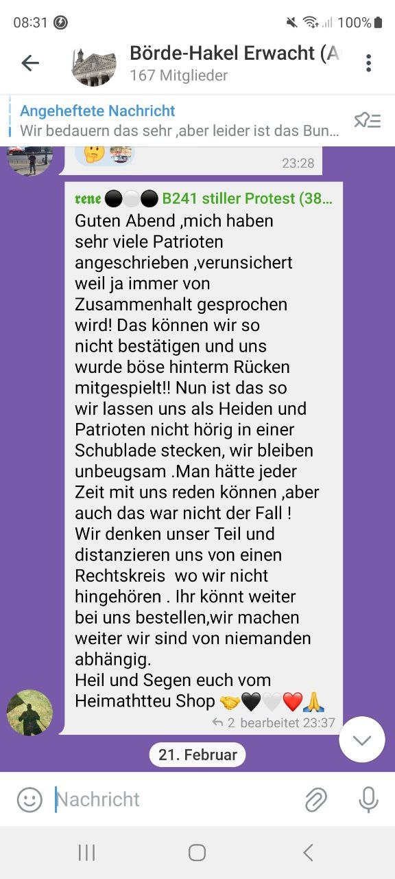Jemanden bewusst ausgrenzen nur weil er seine Gedanken frei äußert und sich nicht mit einer Lüge verbinden möchte, hat absolut nichts mit einem Gemeinsam, Zusammen und Miteinander zu tun. Das ist wie Wasser predigen und Wein saufen. Das ist genau das, was wir in allen anderen Bewegungen täglich sehen. Egal ob VHD, Rüdiger Hofmann, Ronald Gehlken, Matthes Haug, Verfassunggebende Versammlung etc. pp. Sprichst du nicht nach meinem Munde, bist du gegen mich, dann hast du hier nichts verloren. Das ist das System. Von dem rein menschlichen spreche ich erst gar nicht.