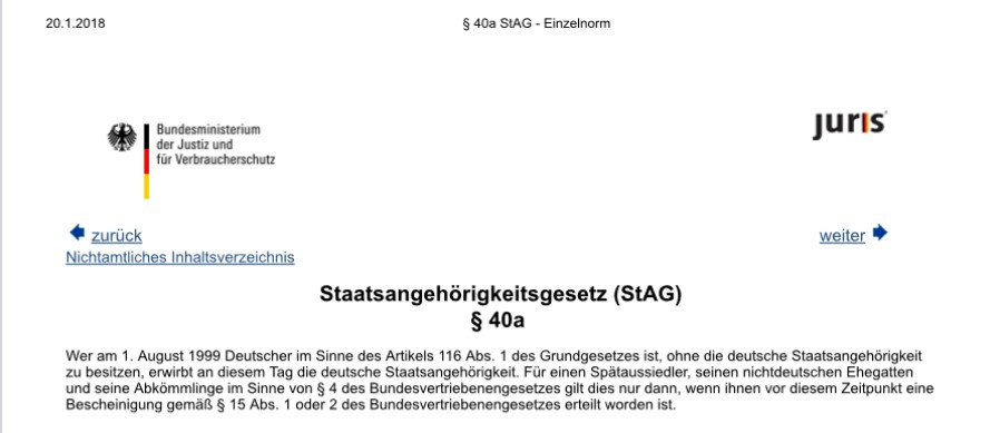 Holt sich jemand seinen EStA Registerauszug, ohne den Staatsangehörigkeitsausweis zu besitzen, ist der Eintrag "deutsche Staatsangehörigkeit erworben am" frei. Allerdings sollte das Datum nach § 40a Staatsangehörigkeitsgesetz (StAG) 1. August 1999 drin stehen. Das ist aber nicht der Fall.