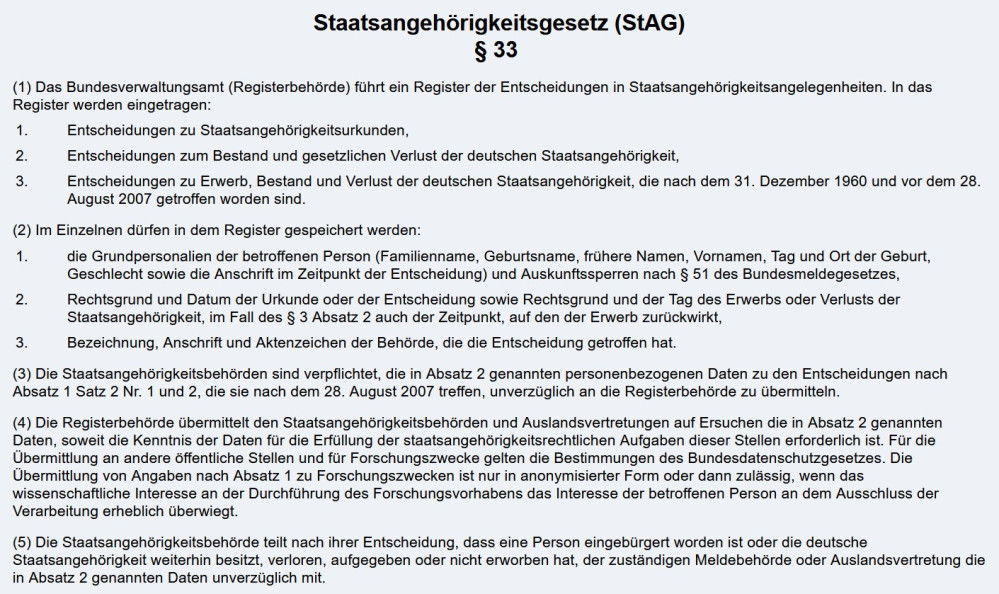 Das Bundesverwaltungsamt führt das Register, in dem alle seit 28.08.2007 von deutschen Staatsangehörigkeitsbehörden getroffenen Entscheidungen gesammelt und gespeichert werden (Rechtsgrundlage: § 33 Staatsangehörigkeitsgesetz).