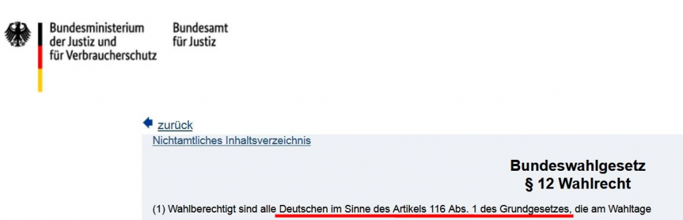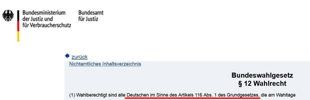 Um dazu legitimiert zu sein in der BRD gemäß § 12 Bundeswahlgesetz wählen zu dürfen