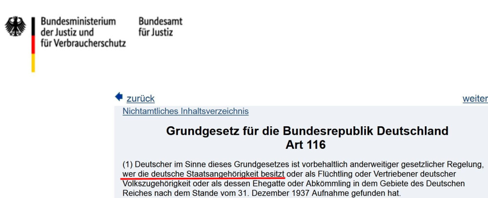 Deutscher im Sinne dieses Grundgesetzes ist vorbehaltlich anderweitiger gesetzlicher Regelung, wer "die deutsche Staatsangehörigkeit" besitzt.