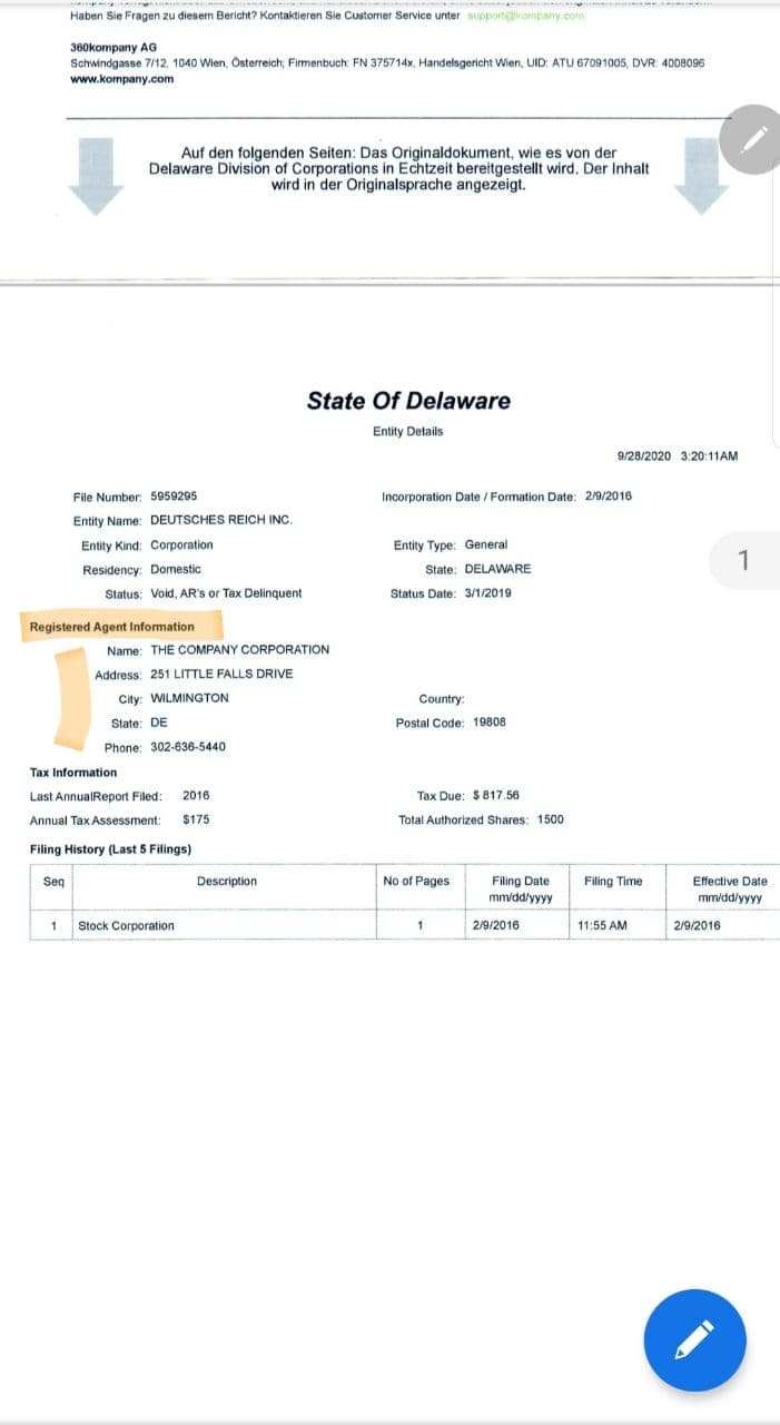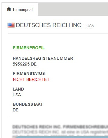 Die Firma „Deutsches Reich Inc.“ wurde am 9. Februar 2016 im US-Bundesstaat Delaware gegründet. Im Jahr 1973 hat das Bundesverfassungsgericht unter dem Aktenzeichen 2 BvF 1/73 festgestellt, daß das Deutsche Deutsche Reich mangels institutionalisierter Organe handlungsunfähig ist.