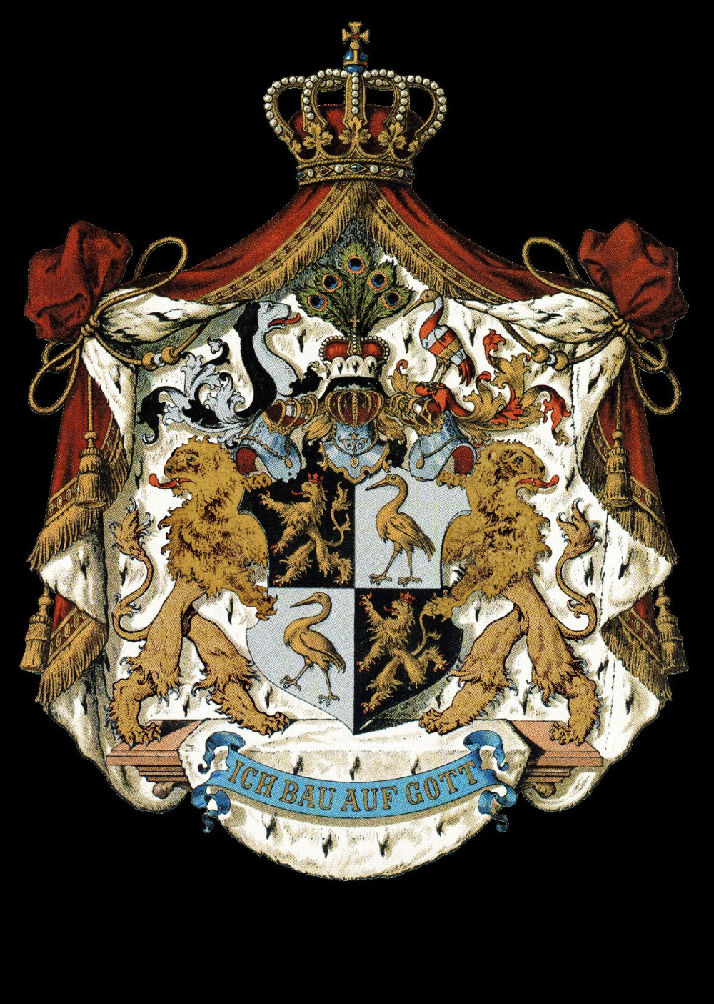 Auch das Wappen des Fürstentums Reuß ältere Linie ziert der Spruch: „Ich bau auf Gott“ und die Landesfarben sind ebenso Schwarz, Rot, Gelb in Anlehnung der alten Reichsfarben.