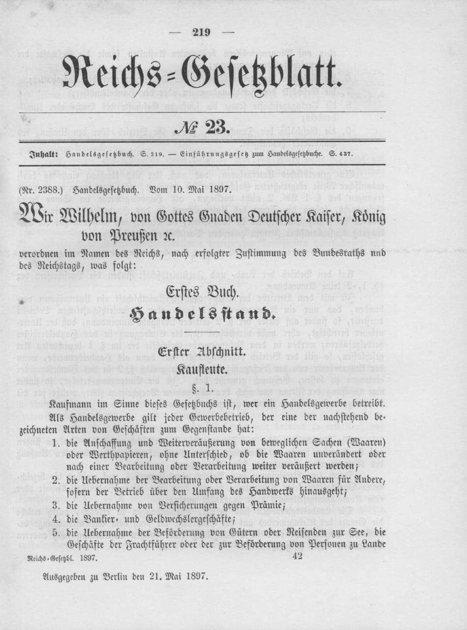 Selbstverständlich wurden im Deutschen Kaiserreich Geschäftstätigkeiten per Definition geregelt. Hierzu gab es das Handeslgesetzbuch, welches als Reichsgesetz erlassen wurde.