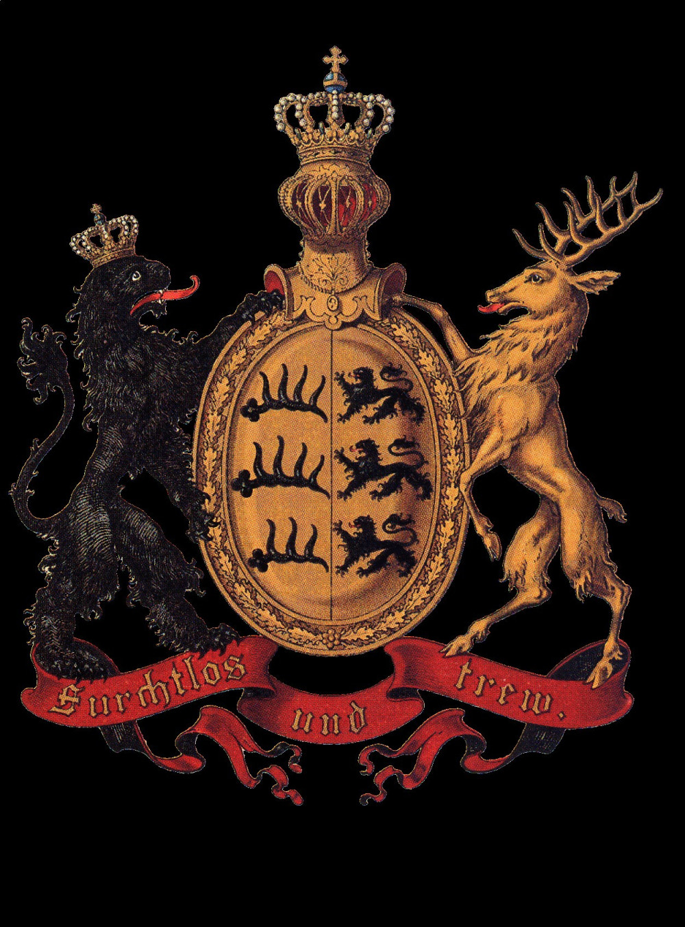 Das Staatswappen des Königreichs beinhaltet zum Beispiel ein schwarzen, königlich gekrönter Löwe und ein goldener Hirsch als Schildhalter und dem Leitspruch „Furchtlos und treu“. Die Landesfarben Württembergs sind Schwarz-Dunkelrot.
