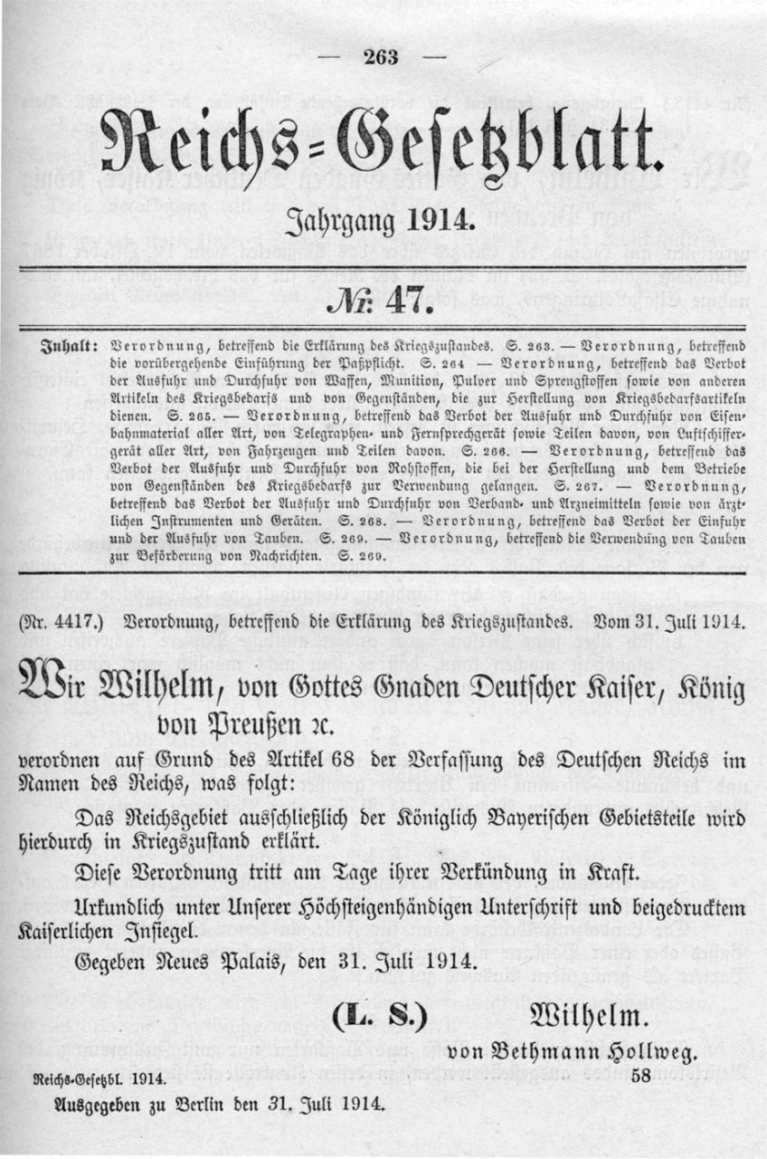 Der Wortlaut der Verordnung, betreffend die Erklärung Kriegszustandes im Reichsgesetzblatt Nr. 47: